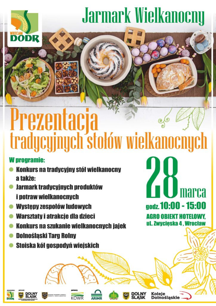 Jarmark Wielkanocny, sobota 28 marca 2026, godz. 10.00–15.00, teren zielony DODR, Wrocław ul. Zwycięska 4. Wstęp wolny. Organizator: Dolnośląski Ośrodek Doradztwa Rolniczego.